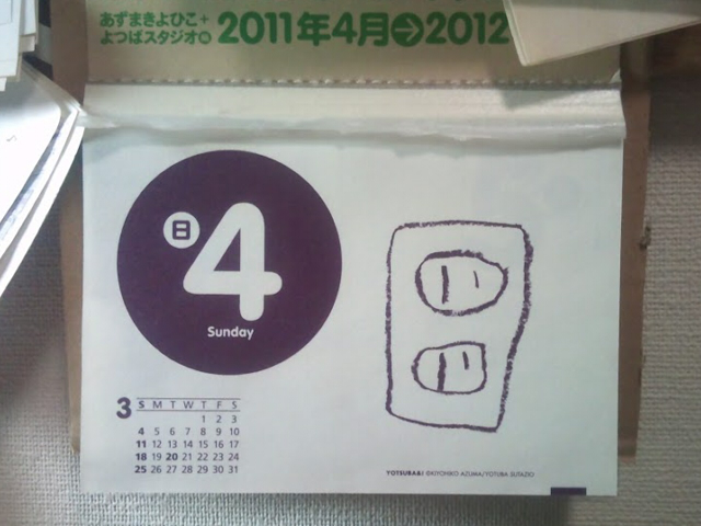 わたしの1日はガツンと苦いコーヒーを飲みながらこの日めくりをめくって始まるなんてことはなく、たっぷり寝坊してから日めくりをめくったり、寝る前に日が替わってたらそのときめくってます。とにかくめくるわけですよ、このよつばとひめくりを。 毎日よつばとのキャラやよつばのお絵描きが日常に溶け込んでくれるので、このひめくりはとても気に入っています。年度カレンダーなので今月でおしまいです。もちろん2012年度版も予約してるので楽しみです。ステマしときますね、ステルスしてねーけど。よつばとひめくり2012。